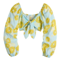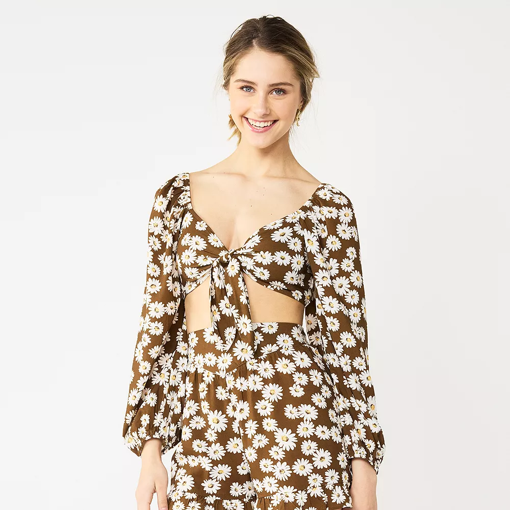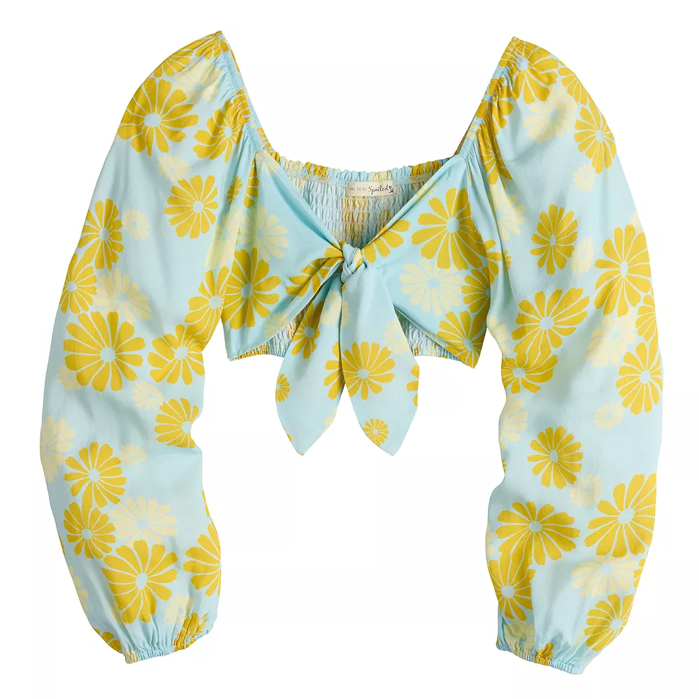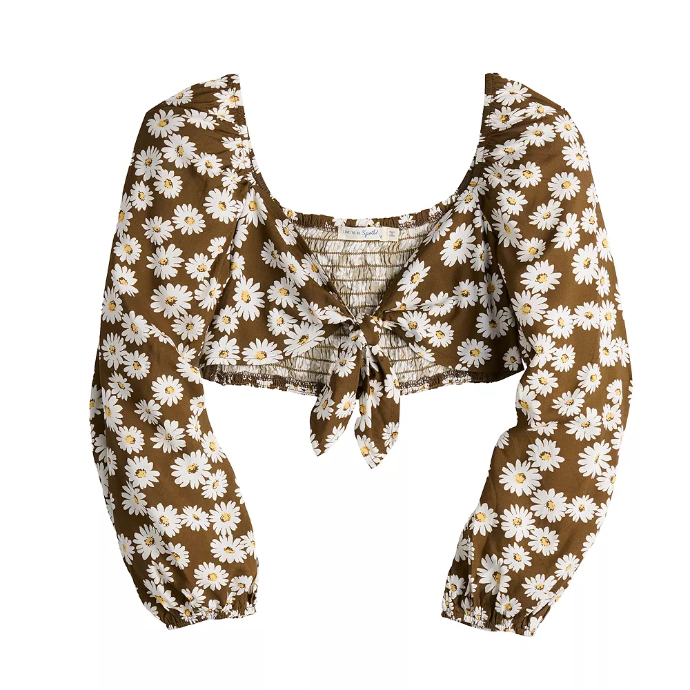 Get your fashion fill with this fabulous juniors’ tied front long sleeve crop top from Live To Be Spoiled.
