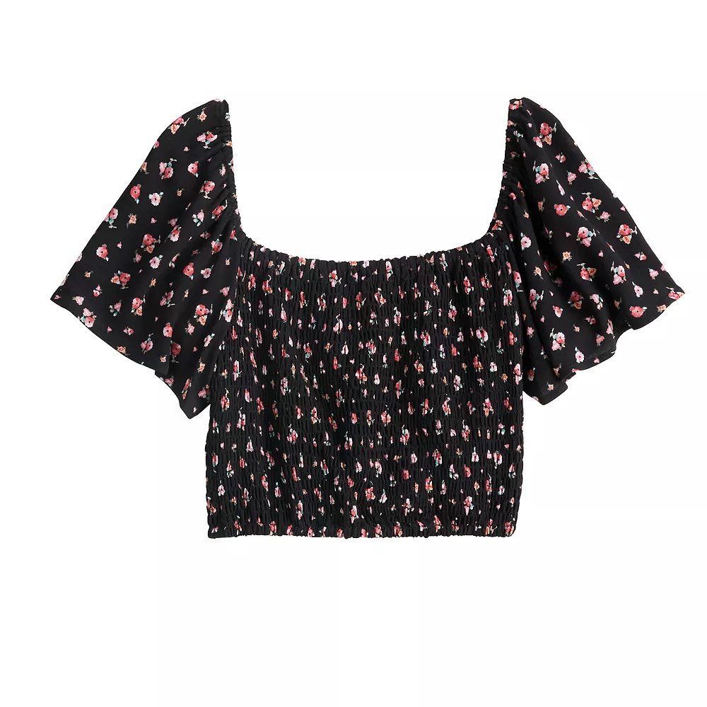 Say hello to irresistible style in this juniors’ short sleeve smocked bodice top from Rewind.