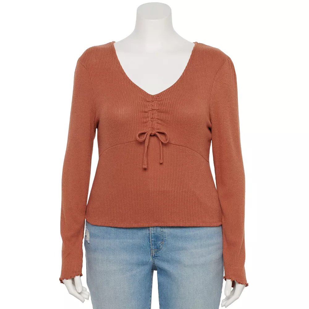For an effortlessly modern look, this juniors’ cinched front SO V-neck top is a must-have.