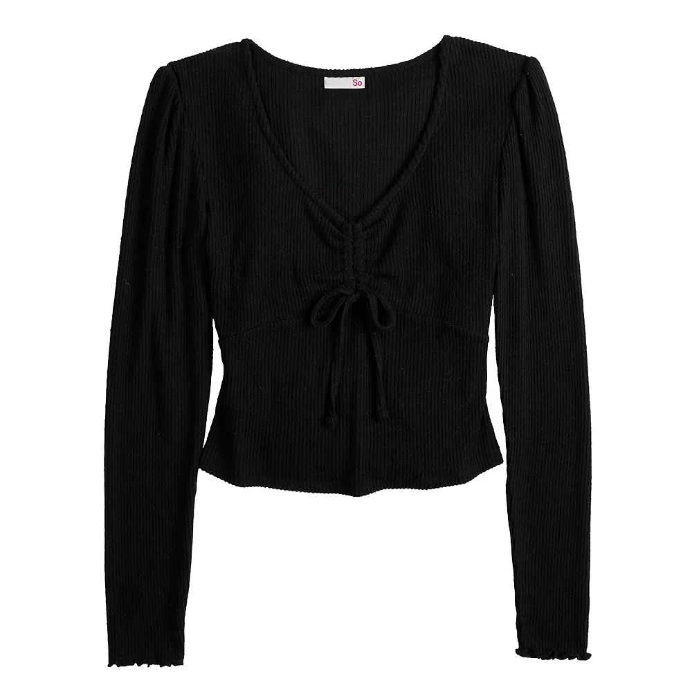 For an effortlessly modern look, this juniors’ cinched front SO scoopneck top is a must-have.