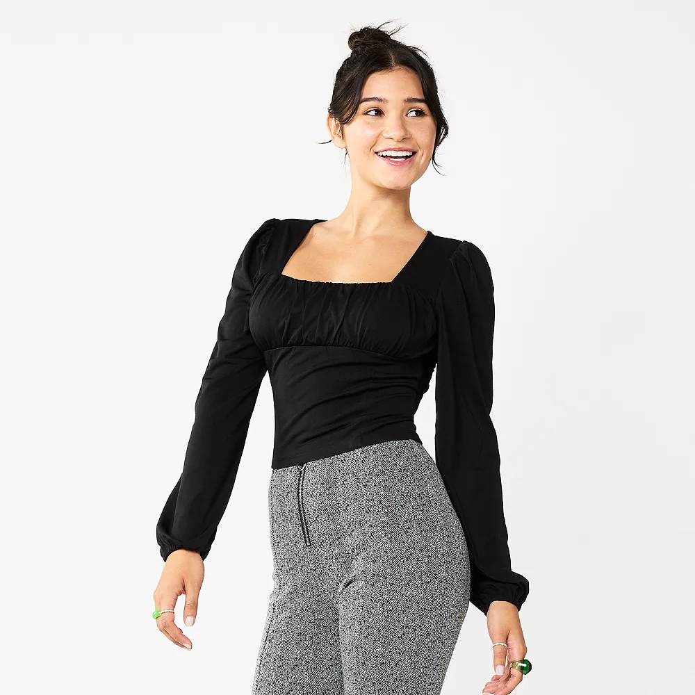 This juniors’ SO shirt has a cropped silhouette and adorable ruching at the bust, you’re sure to arrive in style.