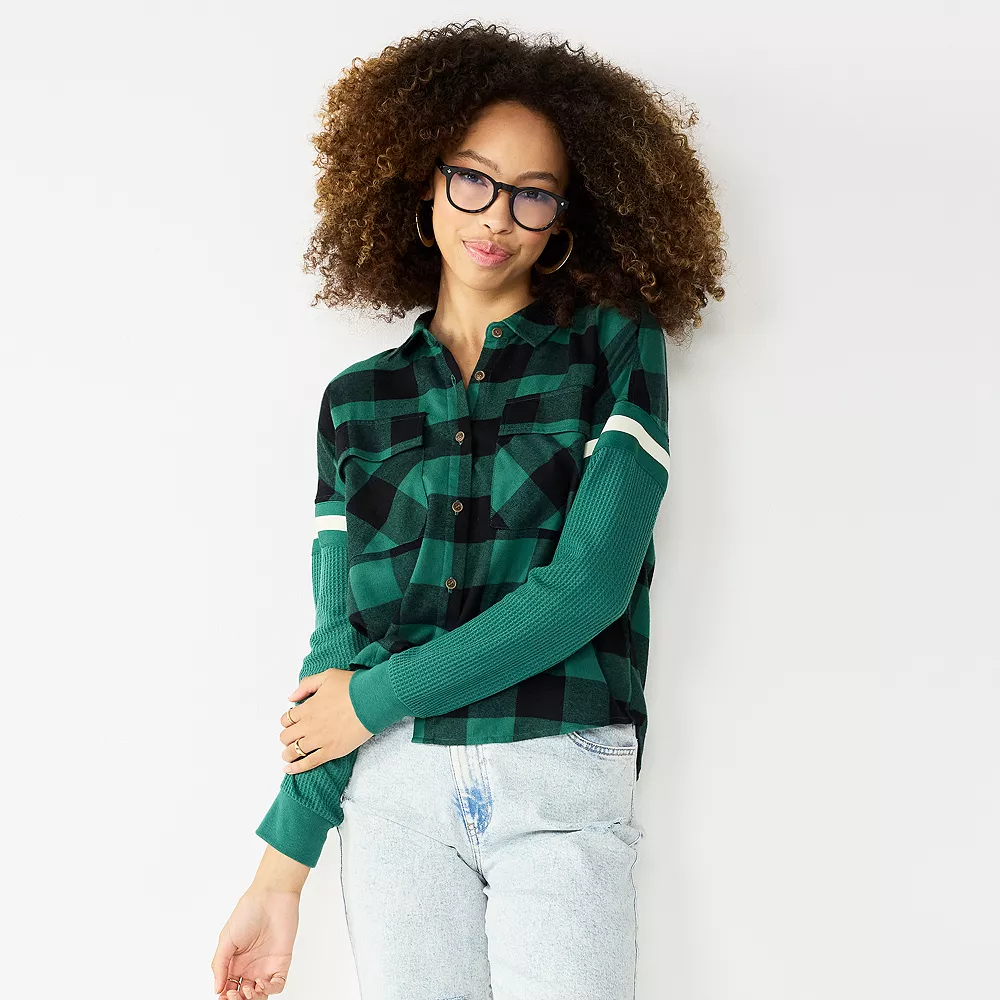 This flannel juniors’ SO top goes from soft knit sleeves to a cute flannel print, making this top as unique as it is stylish.