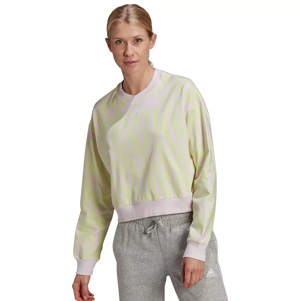 Channel your inner animal. Train with ferocious focus and a bit of tiger-striped fun in this women’s adidas printed sweatshirt.
